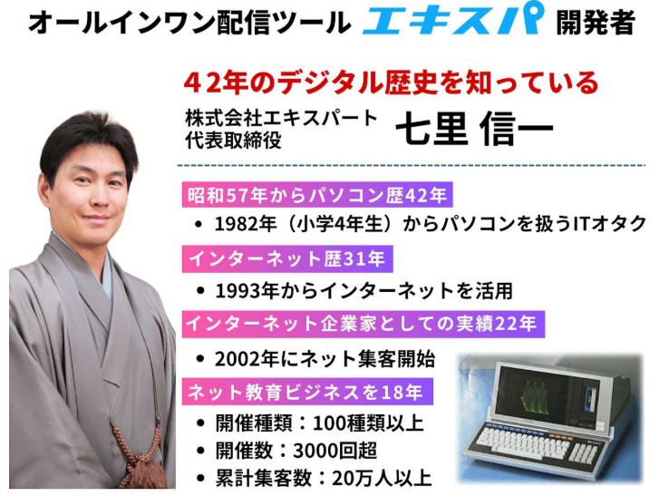 - 七里さんは株式会社エキスパートを設立し、代表取締役をつとめている。
